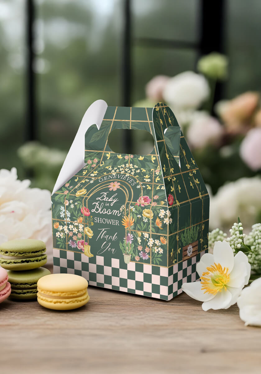 Complement your Baby in Bloom stationery with fresh floral centrepieces, green linens, and delicious garden-inspired treats. Serve refreshing lemonade in charming mason jars and display cupcakes on rustic vintage wood trays, accented by florals nestled in wooden crates, watering cans, and cheerful yellow rain boots. To echo the greenhouse garden terrarium theme, incorporate elegant gold terrarium centerpieces filled with blooms or softly glowing candles. Don’t forget to delight your guests with seed packet favors, perfect for planting and cherishing long after the celebration. With our hand-painted designs as your inspiration, your baby shower will blossom into a joyful, heartfelt event filled with beauty and warmth.