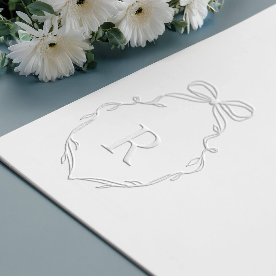 Add a personal touch of elegance to your wedding stationery with our bows & vows monogram crest wedding embosser. This exquisite design features our hand-sketched, delicate coquette bow, complemented by a ribbon and leaf monogram crest—creating a charming and timeless aesthetic. Customizable with your monogram initial, this embosser is the perfect way to elevate your wedding details, whether sealing envelopes, adorning favor bags, or enhancing any piece of wedding stationery. The subtle sophistication of this embosser brings a touch of romance and refinement to every occasion, offering a beautifully personal way to mark your special day. Perfect for couples looking to add a unique and thoughtful finishing touch to their wedding decor. Design and hand-drawn artwork by © Moodthology Papery.