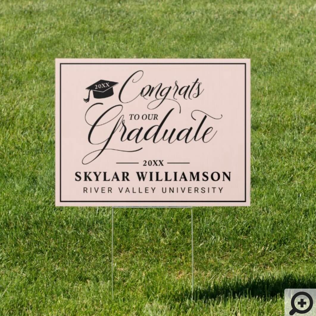 Congratulate and celebrate your graduate with our elegant and stylish congrats to the graduate blush and black graduation sign. The design features “Congrats To Our Graduate” displayed in a stylish & elegant script text pairing. A mortarboard grad cap is incorporated into the design and personalized with graduation year. Personalize with your graduate’s name, their year of graduation & school.