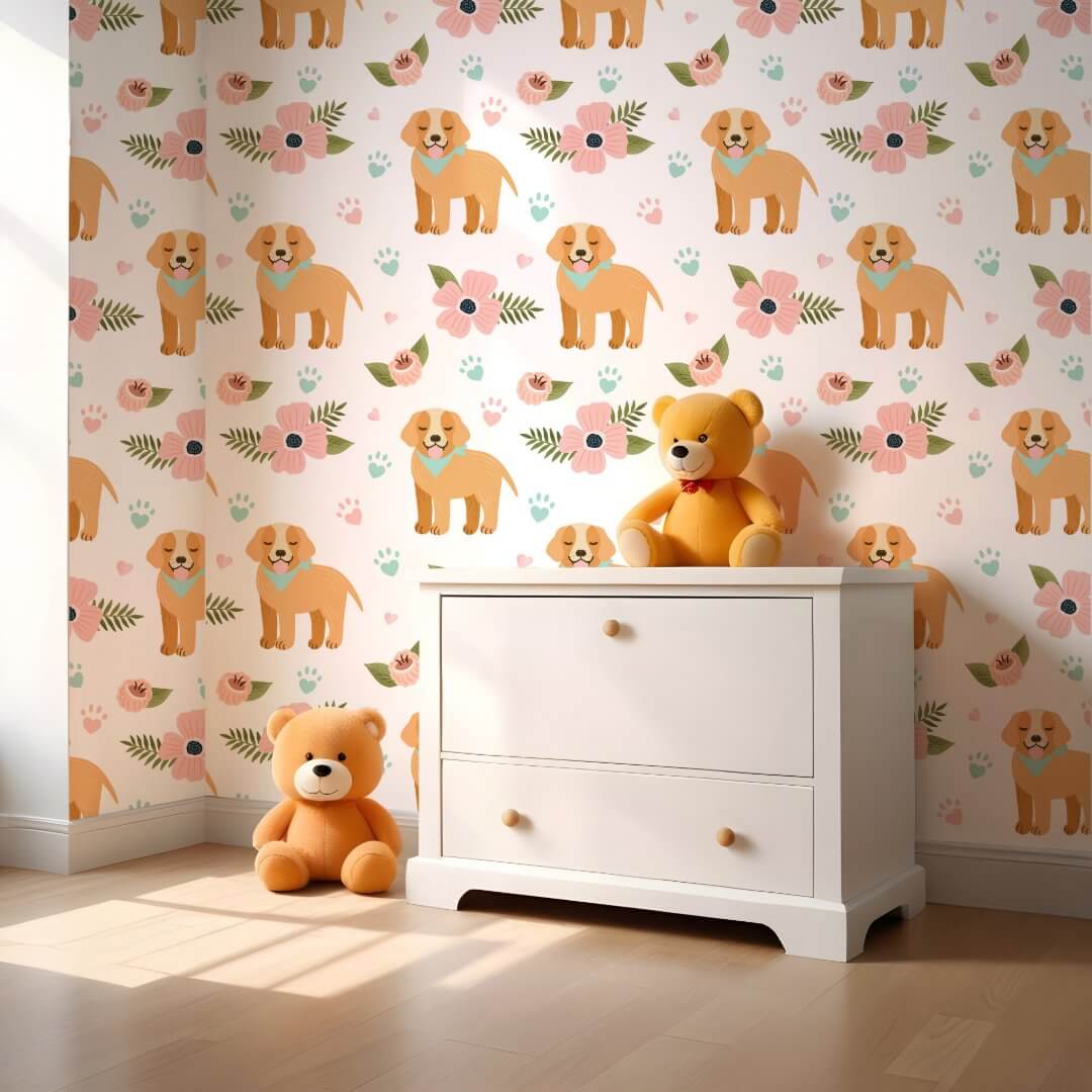 Infuse your child’s room or nursery with joy and whimsy with our adorable golden retriever puppies and floral peel-and-stick wallpaper. Perfect for creating a happy and inviting atmosphere, this charming wallpaper is the ideal choice for parents looking to add a touch of playful beauty to their home. Our wallpaper showcases an enchanting scene with hand-drawn golden retriever puppies, surrounded by cute pink flowers and playful paw prints. This delightful design is sure to bring smiles and warmth to any room. Designed by Moodthology