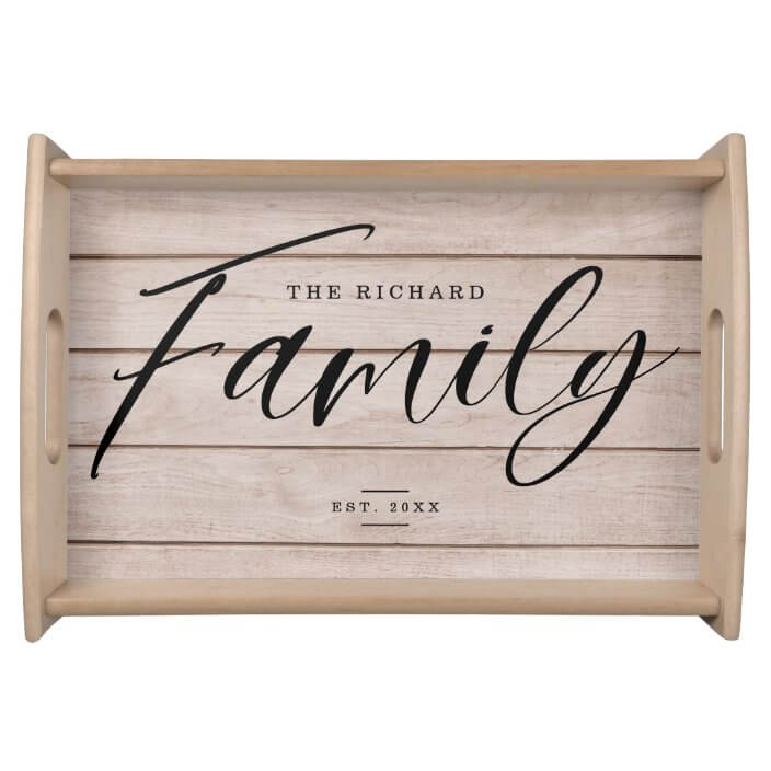 Family Script Faux Light Wood Plank Custom Name Serving Tray