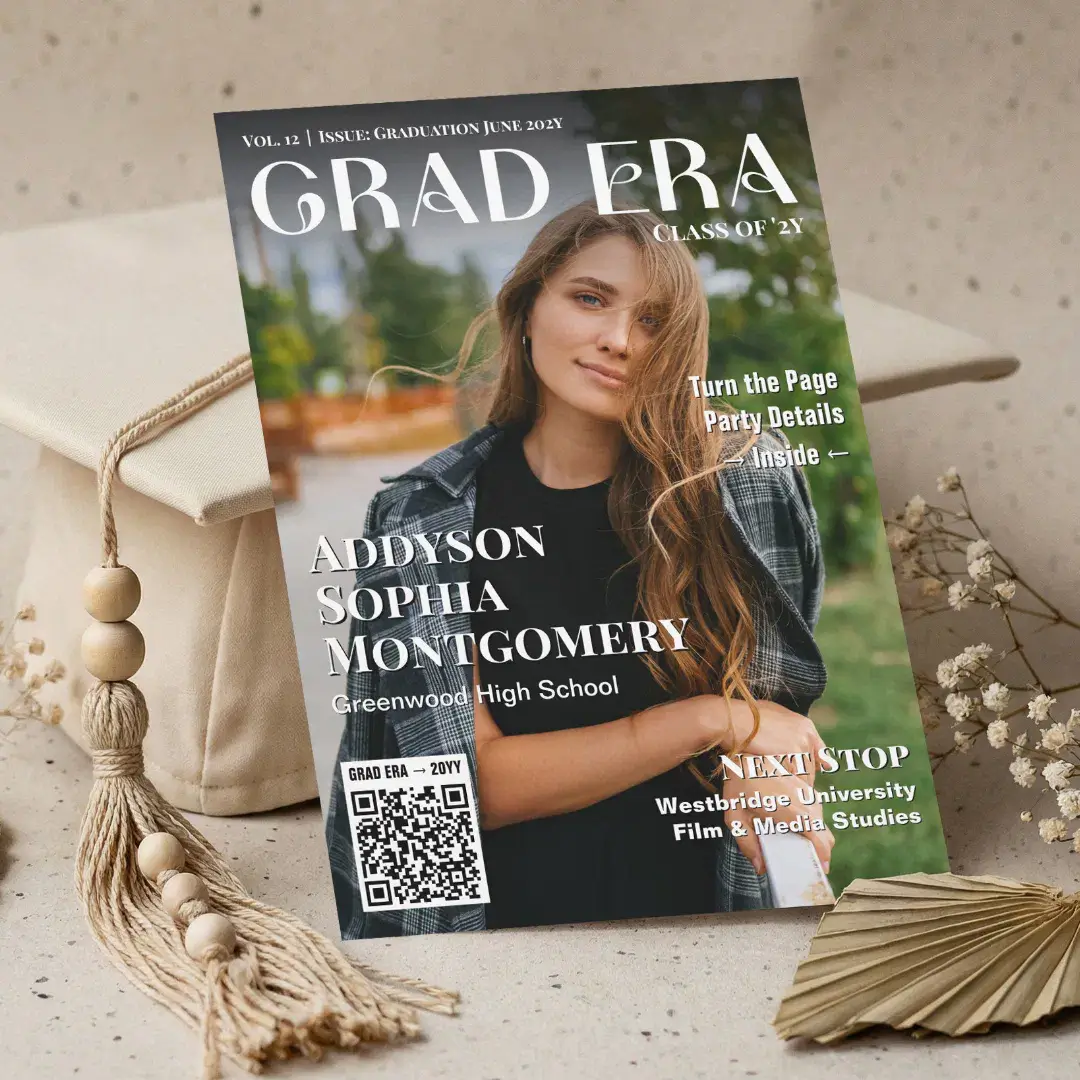 Celebrate your graduate in style with this Grad Era Trendy Graduation Magazine Photo Collage Invitation and announcement, a one-of-a-kind keepsake that showcases a full-cover photo of your grad. Personalize it with the graduate’s name, the school they are graduating from, their plans for college, and additional custom text highlighting the back-side party invitation. The back is designed like a magazine inside spread, featuring three personalized photos, full party details, and a playful editorial-style layout that celebrates your grad’s achievements and milestones. You can even add a custom QR code for quick RSVPs or digital party details, making this design both memorable and interactive — perfect for announcing your graduate’s accomplishments and inviting friends and family to the celebration. Great for high school graduation, college graduation, elementary graduation, and more. Design by © Moodthology Papery