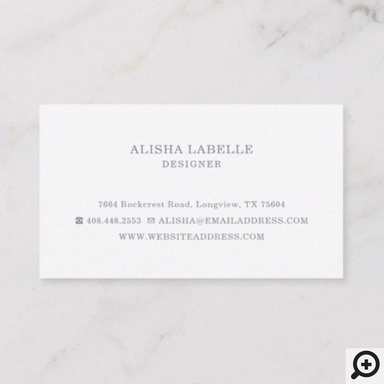 Grey background with faux silver confetti polka dot pattern framing the company name. The reverse side features the contact information displayed in a clean and minimal layout. You can customize the font, layout and background color for your own personal preference.