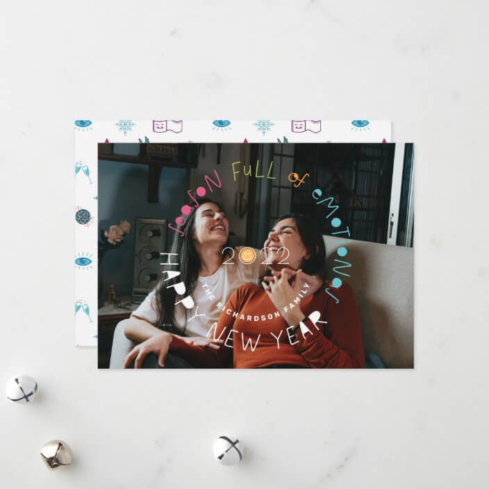 Celebrate a season full of different emotions from joy, laughter, love, special moments, and unexpected challenges with our uplifting, colorful and cheerful emoji-inspired happy New Year photo card design. Our design captures different emotions and Christmas symbolisms with our fun emoji-style icons. “Season Full of Emotions, Happy New Year is displayed in a fun colorful design and personalized with a family photo, family signature, and year. The back of the card features a fun emoji pattern. A fun non-traditional Holiday design for a non-traditional season. All illustrations are hand-drawn original artwork by Moodthology Papery.