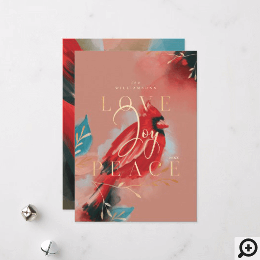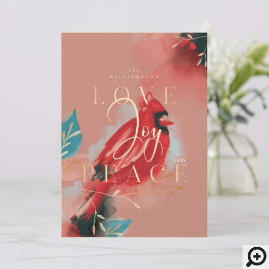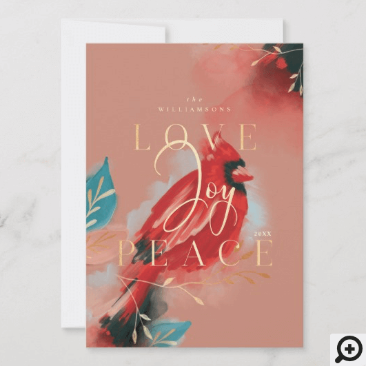 Love Joy & Peace Red Cardinal Watercolor Blush Holiday Card
