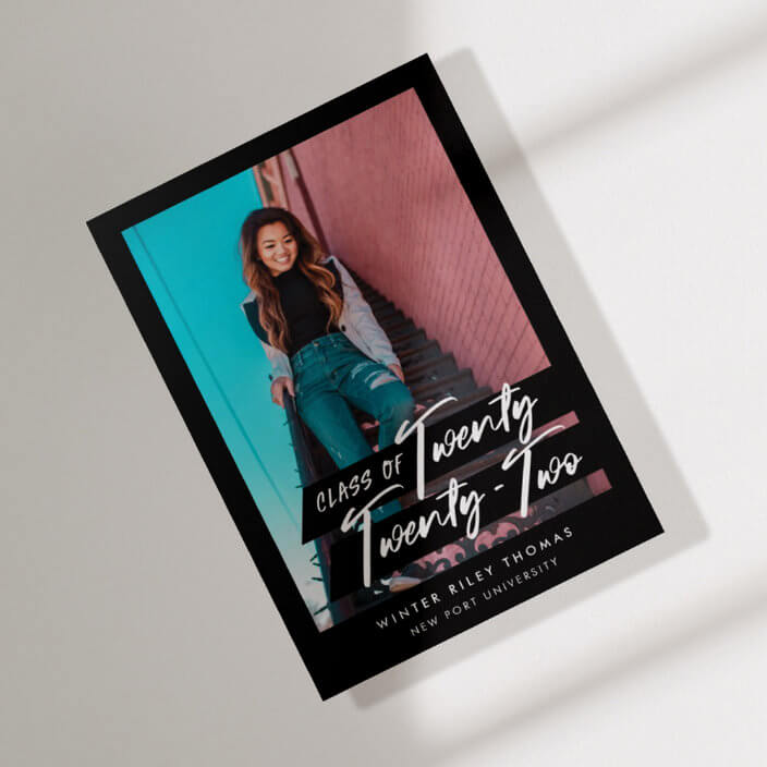 Announce and celebrate the graduate with our modern and stylish class of Twenty Twenty – Two graduate announcement cards. Our design features a large photo template to display the grad’s photo. Trendy modern script class of twenty twenty-two displayed over the over with a bold modern call-out design. Personalize with grad’s name and school. Design by Moodthology Papery.