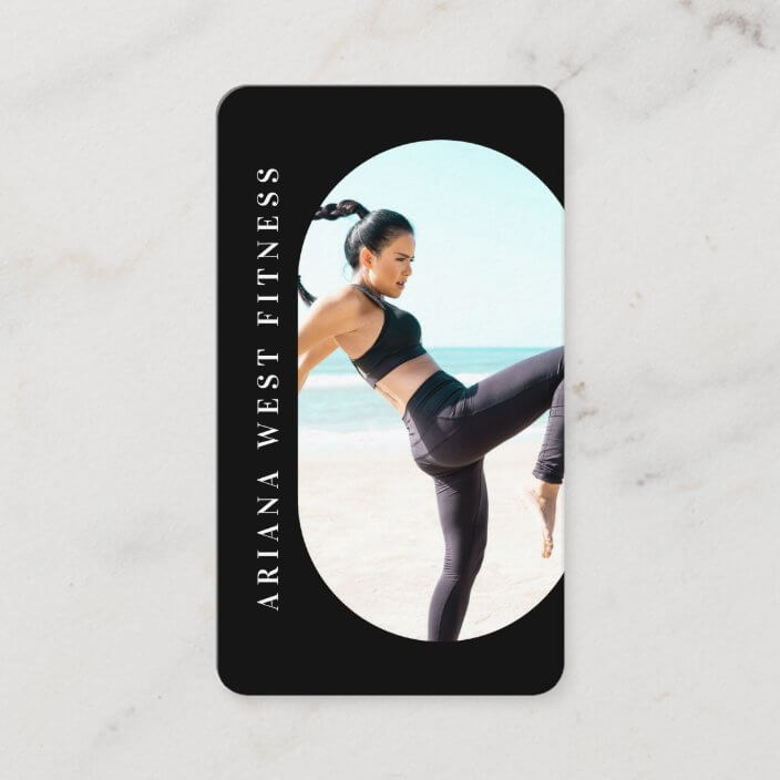 Modern and trendy two photo fitness business cards. Add your photo inside the modern circular photo frame. Customize with your business name. On the reverse side add your name, job title, and contact info as well as a second photo. Perfect for personal trainers, fitness trainers, yoga instructors, fitness influencers and so much more. Designed by Moodthology Papery