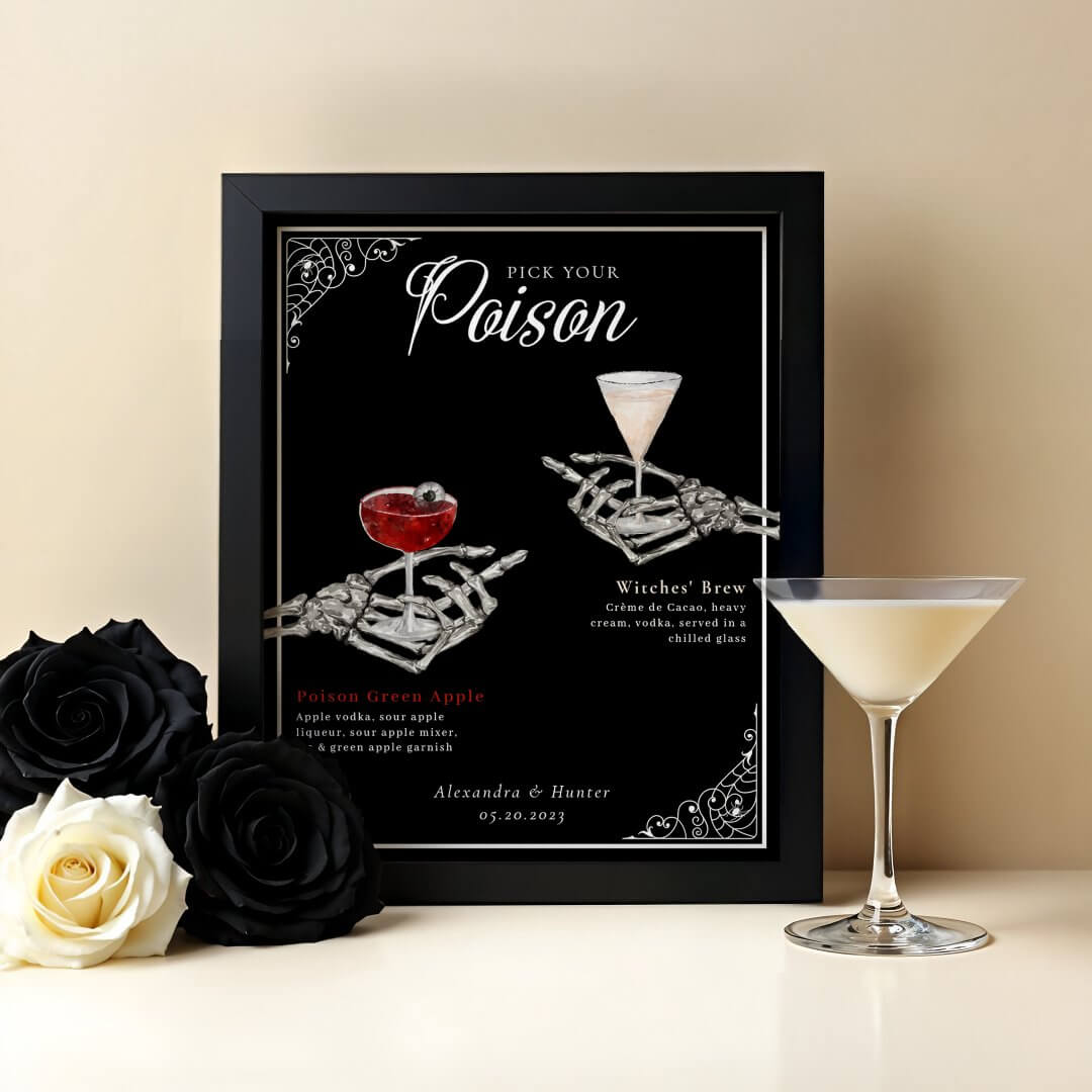 Nothing screams “I do!” like a Halloween-inspired gothic wedding drinks sign. Get ready for a bone-chillingly beautiful celebration like no other with our ‘Til Death Do Us Part’ skeleton & floral Halloween gothic theme bride and groom signature drinks gothic wedding sign. Our beautiful gothic pick your poison wedding cocktail sign features our hand-painted watercolor skeleton hands, each holding a different drink, along with your drink name and description. Perfect for Halloween weddings or couples seeking a dark gothic-style wedding vibe. All illustrations are our hand-drawn original artwork. Design & artwork by Moodthology Papery