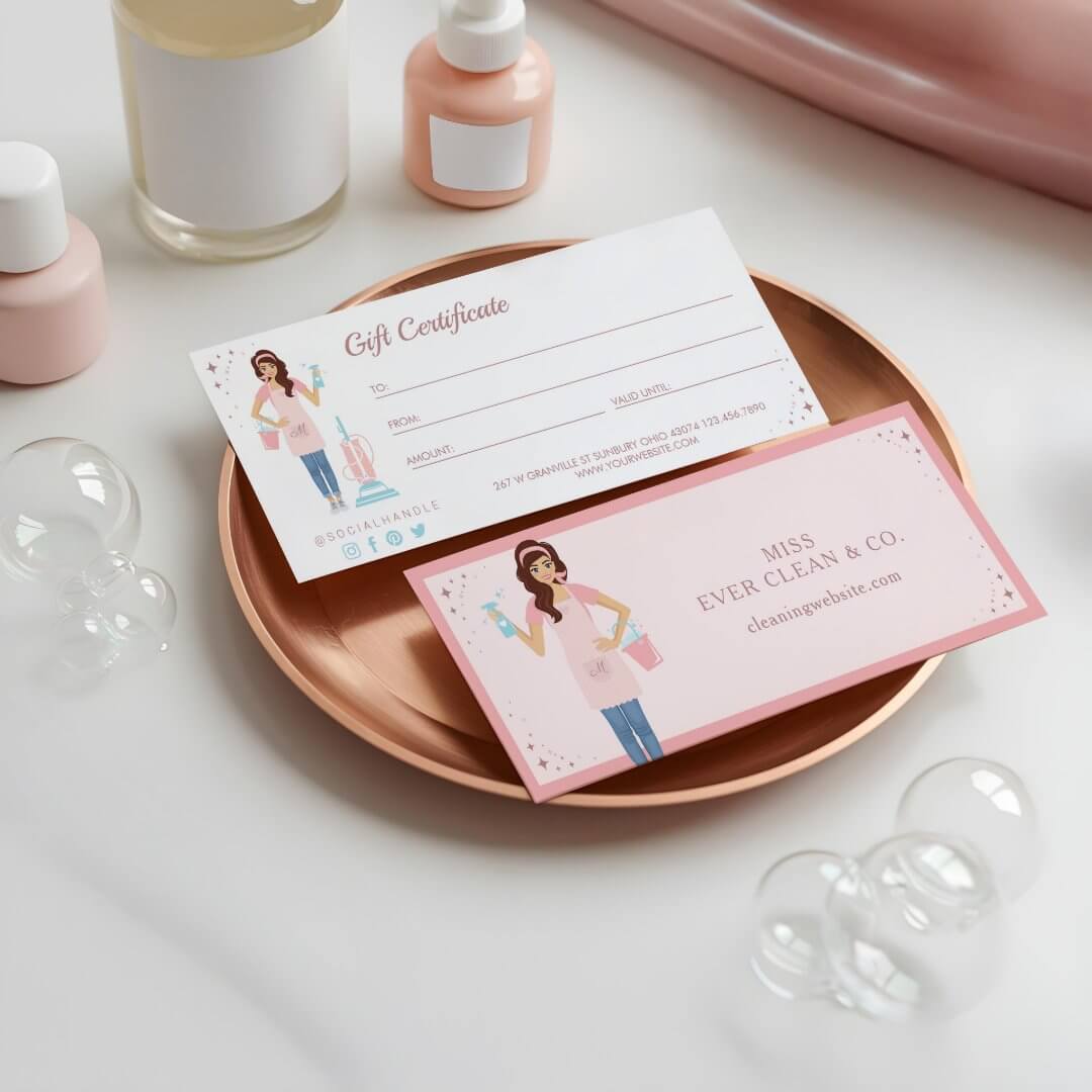 Modern and professional cleaning services gift certificate featuring a beautiful, smiling, and friendly woman with one hand on her hip, holding a bucket of soapy water, and the other hand holding a cleaning spray bottle. The lady is dressed in a cute blush pink striped apron, a blush pink shirt, and denim jeans. The design includes a two-tone pink frame with heart accents and sparkling details. Customize with your business name, website, and monogram placed on the apron pocket. The reverse side features the gift certificate information along with contact info, social handles, and icons. Perfect for gifting cleaning services to your clients. All illustrations are hand-drawn original artwork by Moodthology Papery.