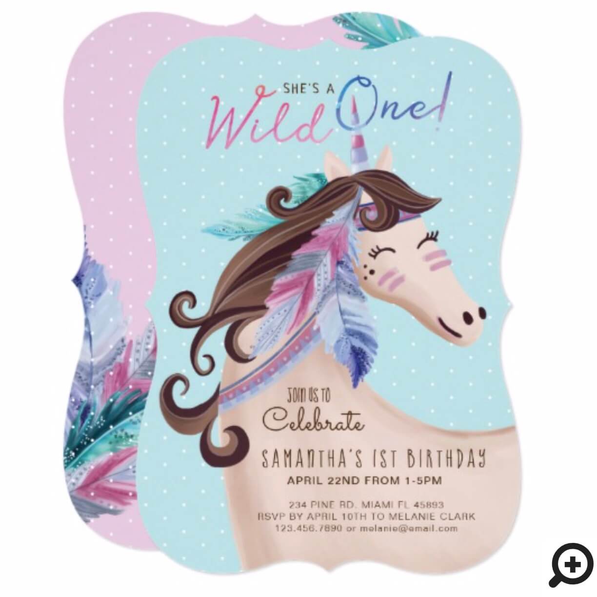 Celebrate your beautiful little wild one’s first birthday celebration with our sweet wild tribal unicorn birthday invitation. The design features our hand-painted wild unicorn watercolor illustration adorn with beautiful hand-painted watercolor feathers and decorative paint. she’s a “wild one” typography in a brush watercolor script. The birthday party invite details are neatly placed within the body of the unicorn. A light soft pastel blue background with white polka dots adds a whimsical style. The reverse side is designed in a light pink with our beautiful watercolor feathers framing the edges of the invite. All illustrations contained in our wild one tribal unicorn birthday invitation are hand drawn original artwork by Moodthology.