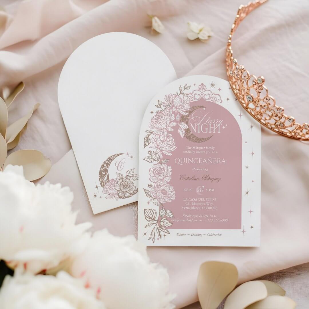 Celebrate a magical milestone with our elegant Starry Night Quinceañera invitation, featuring our original hand-drawn artwork for a one-of-a-kind celebration. This whimsical design showcases our hand-drawn delicate crescent moon with “Starry Night” in elegant typography, twinkling stars, and soft botanical florals, all illustrated in a dreamy blush rose pink and golden beige palette. A regal Quinceañera tiara is nestled within a graceful floral arch, with twinkling stars cascading gently along the side—symbolizing beauty, growth, and her shining path forward. Perfect for celestial, moonlight, or starlit-themed Quinceañeras, this invitation blends elegance with dreamy romance. Please note that all colors can be changed to suit your party theme and color decor. Original hand-drawn illustration and design by © Moodthology Papery.