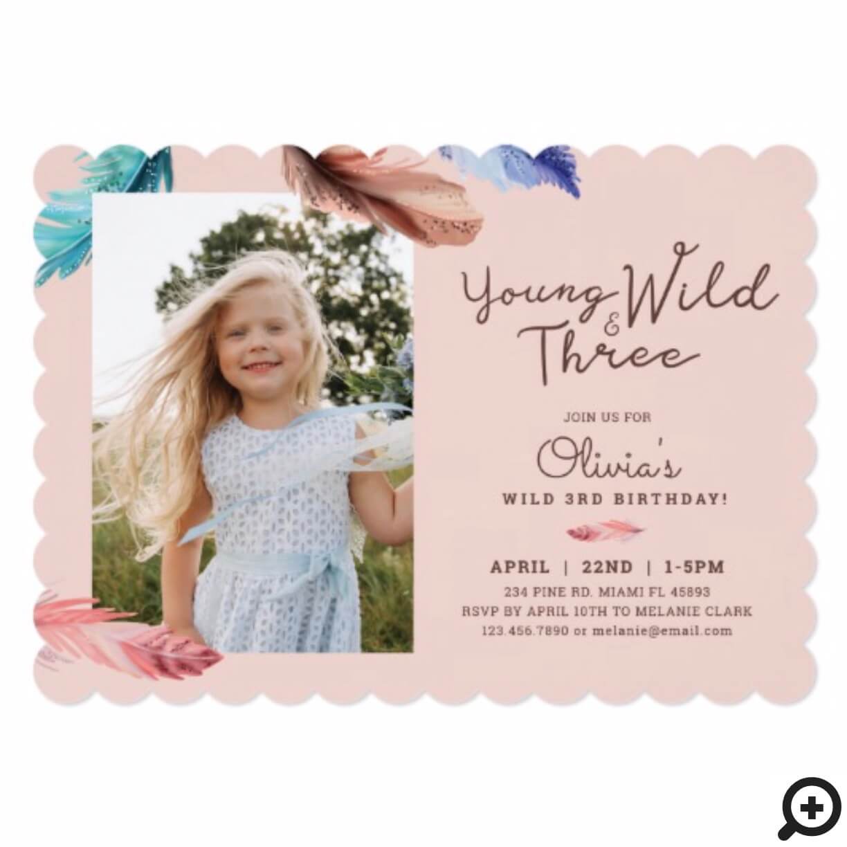 Young Wild & Three Watercolor Boho Feathers Photo Invitation